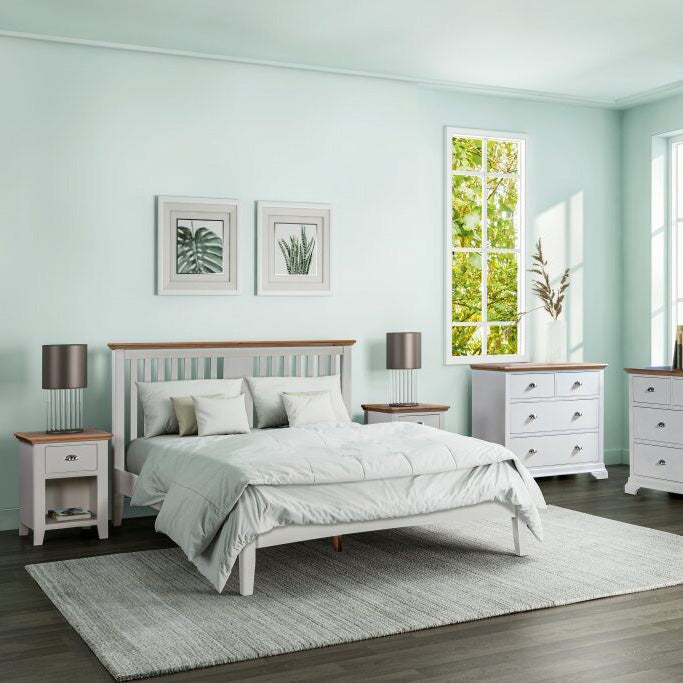 Experience the perfect blend of modern style and exceptional craftsmanship with the Angela King Bed Frame. This stunning bed frame brings a bright and contemporary feel to any bedroom, seamlessly blending soft grey tones with a beautifully crafted oak offset. The result is a striking bed that will elevate the look of your space. With dimensions of 2170 W x 1650 D x 1100 H mm, this king-sized bed frame offers ample room for a comfortable night's sleep. Transform your bedroom into a stylish sanctuary with the Angela King Bed Frame, where elegance and comfort meet in perfect harmony.