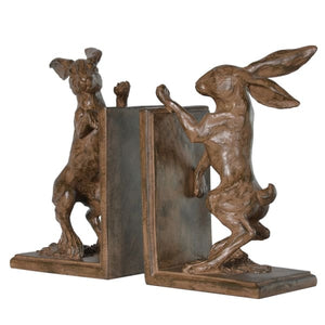 Add a touch of playful charm to your bookshelf with this unique pair of Boxing Hare Bookends. Crafted in bronze with a brown finish, these bookends capture a lively scene: one hare stands upright, poised to deliver a punch, while the other has fallen back, mid-battle. Both hares stand on their hind legs, with expressions that reflect determination and a hint of worry. Perfect for adding character to any room, these bookends bring a whimsical yet artistic touch to your home decor.