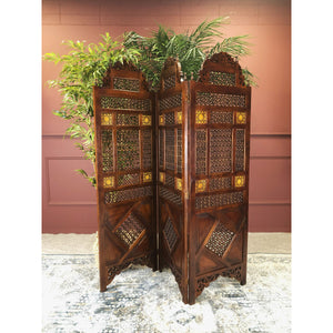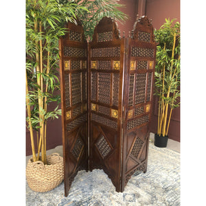 A Burmese Three Fold Screen arched panels with pierced bobbin turned and inlaid panels on moulded legs