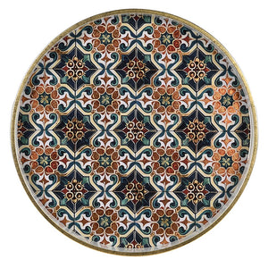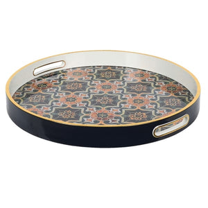 Infuse your space with vibrant colours and intricate design with this Moroccan-inspired round tray. Showcasing a captivating blend of geometric shapes and floral motifs, the tray features a rich palette of navy blue, white, pink, orange, yellow, green, red, grey, and black. Perfect for serving or as a striking decor piece, this tray adds a splash of colour and a touch of exotic elegance to any room. Its bold patterns and vibrant hues make it an eye-catching addition to both modern and traditional interiors.