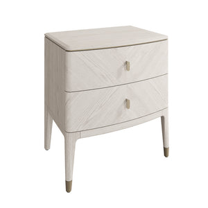 The Diletta 2 Drawer Bedside Locker in Stone from our Luxury Bedroom Collection exudes Art Deco elegance. Crafted with ash wood veneers in a V match pattern, it showcases meticulous detail. Ebony-colored wood and brushed gold metal hardware add a touch of opulence, making it a sophisticated addition to your bedroom decor.