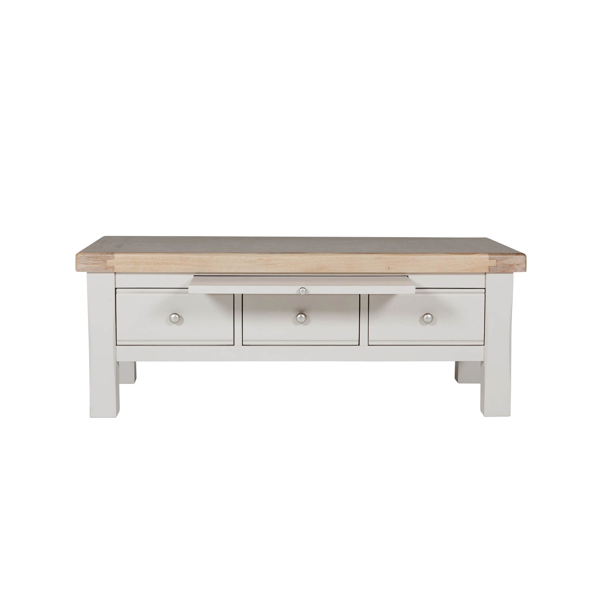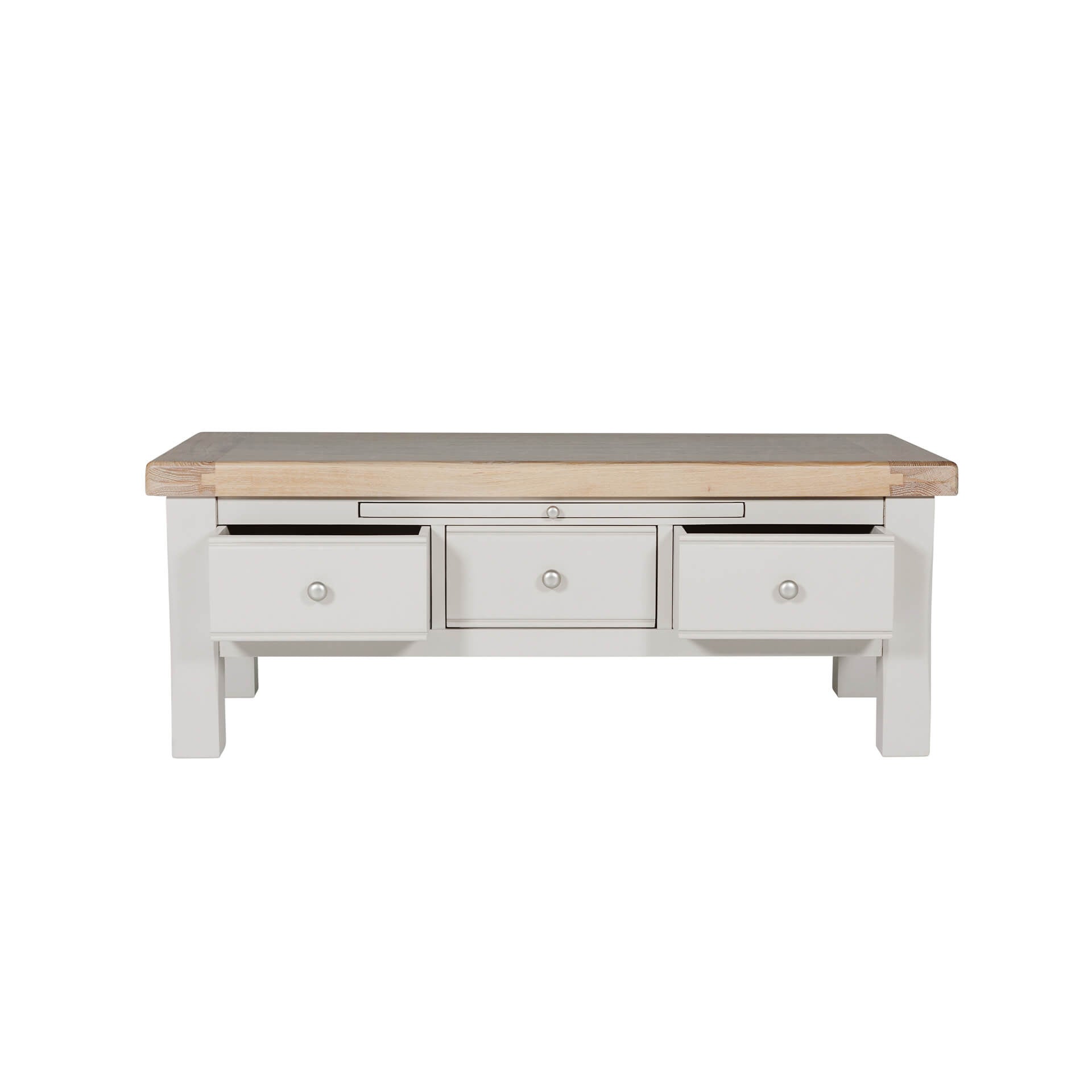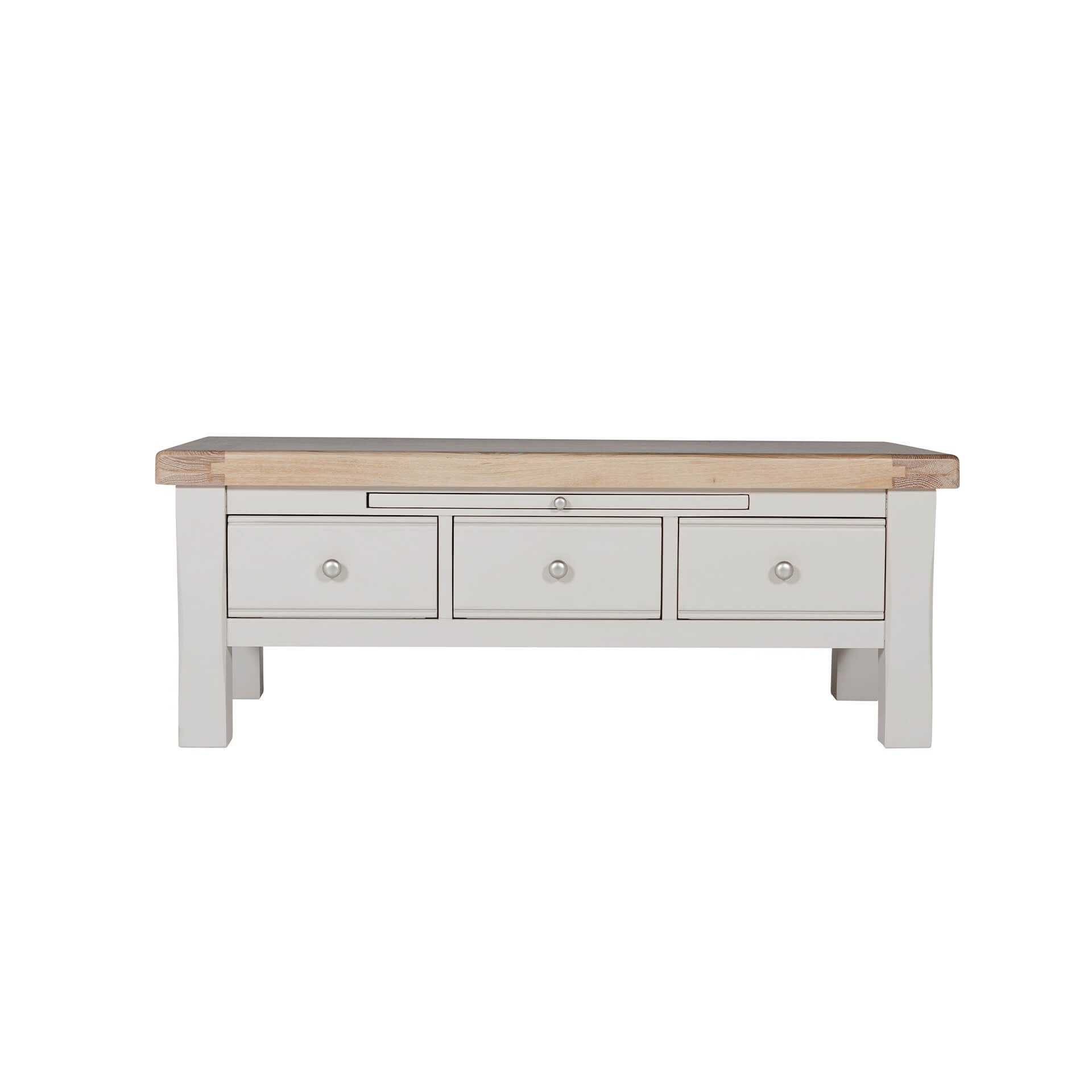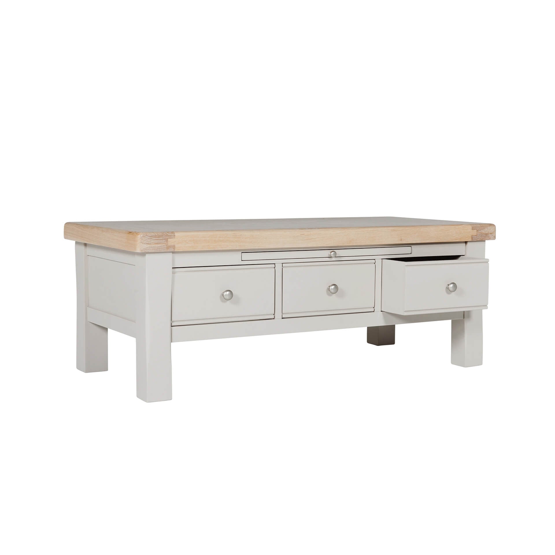 The Doune Coffee Table is a stylish and functional addition to any living room. Its sleek design and soft taupe finish complement a variety of interior styles. The three drawers offer convenient storage for remotes, magazines, or other essentials.