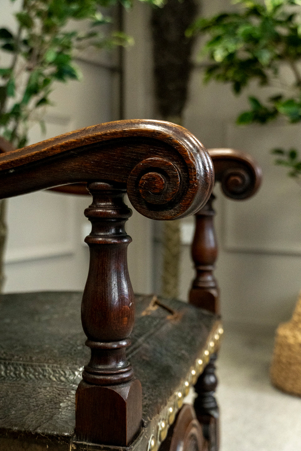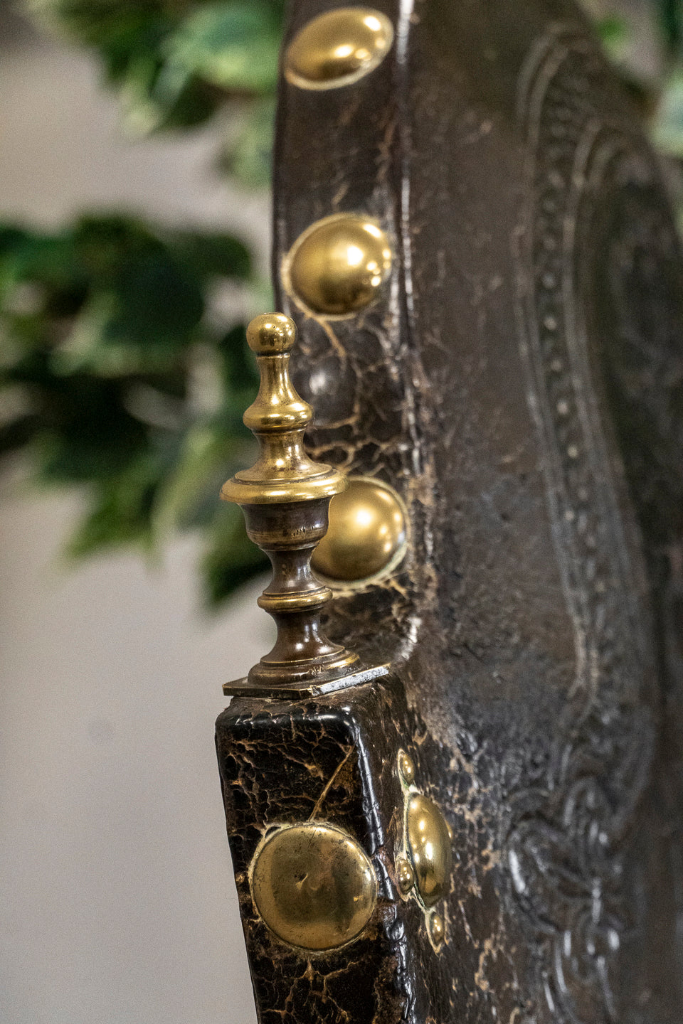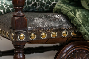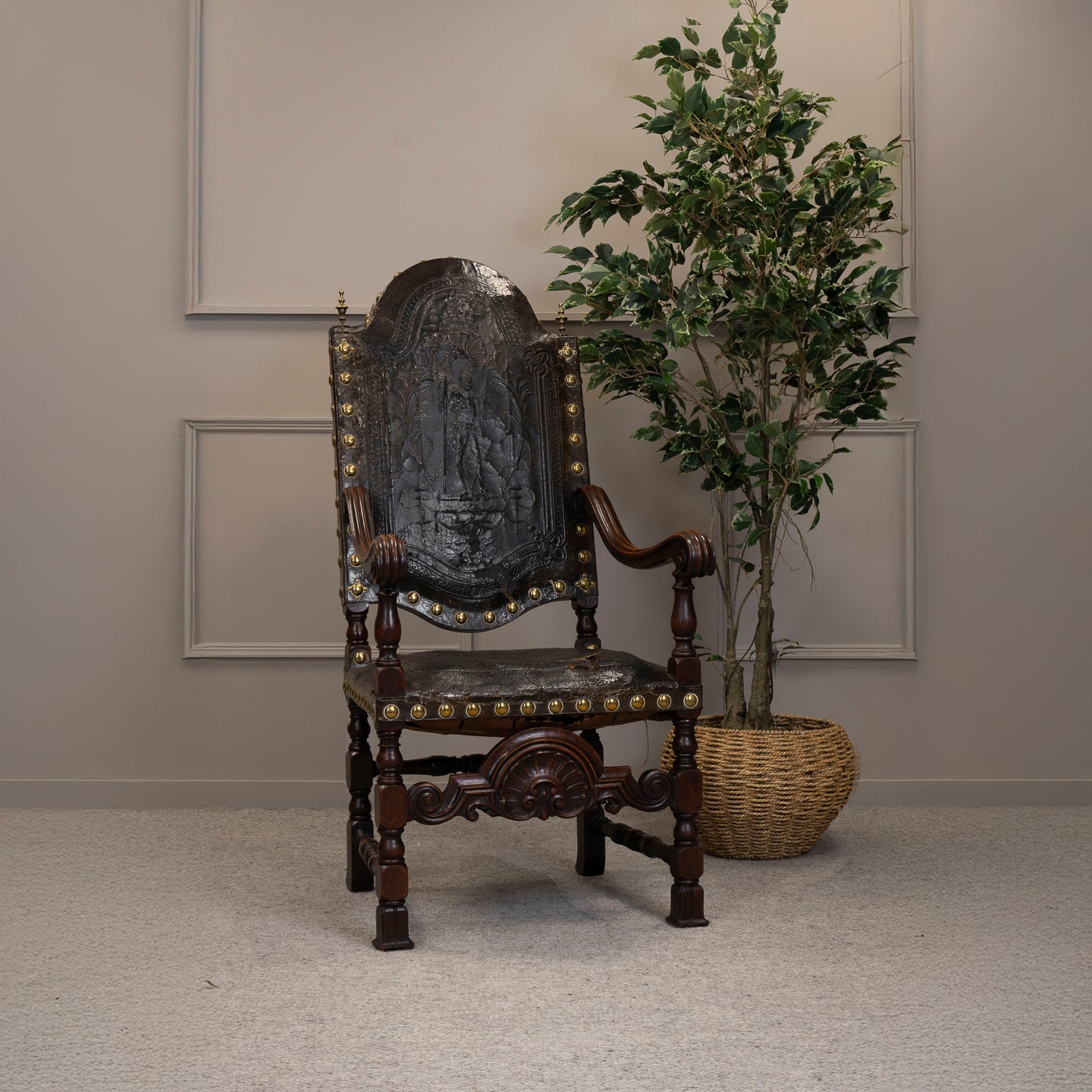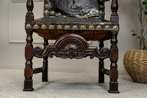 Early 19th Century Carved Oak Hall Chair with brass studded embossed Leather