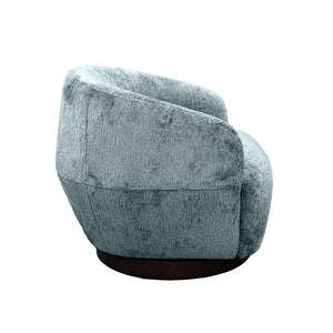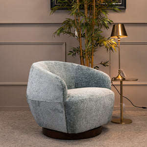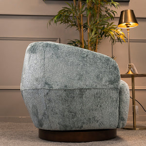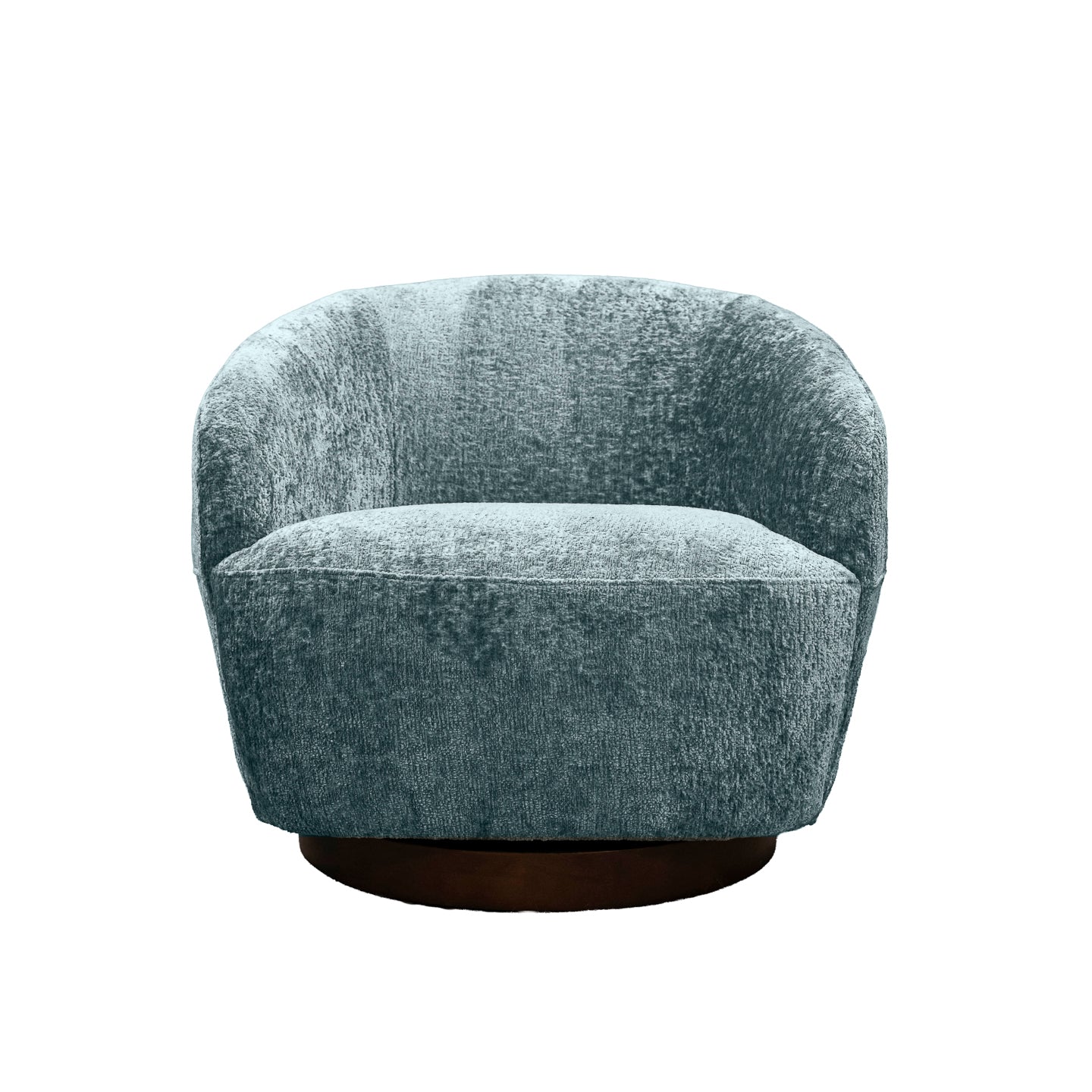 The Koto Swivel Chair is a modern accent piece that combines comfort with contemporary style. Upholstered in a rich blue fabric, it’s set on a sleek wooden swivel base that adds warmth and versatility.