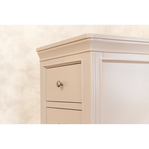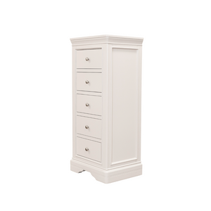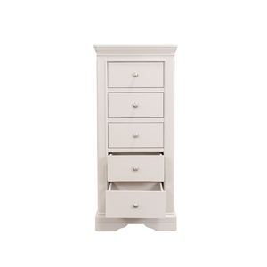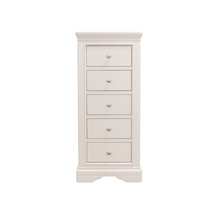 The Lara Tall Boy in Light Taupe with 5 drawers offers a stylish and practical storage solution for bedrooms where space and organisation matter. Its tall, slim design provides generous drawer storage while maintaining a compact footprint, making it ideal for both large and smaller rooms.