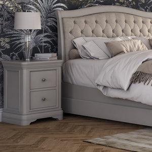 Introducing the Mabel Bedside Table: Elevate Your Bedroom with Timeless Beauty and Practicality. Designed to showcase the natural beauty of wood, this taupe painted collection exudes elegance with its silver handles and graceful curves. Crafted with durability in mind, each piece is both beautiful and practical. Featuring button tufted details, curved headboards, and decorative accents, this range adds a touch of sophistication to any space. Made with high-quality materials including linen look fabric, MDF, metal, and pine, the Mabel Bedside Table offers lasting quality and style. Transform your bedroom into a haven of comfort and style with the Mabel Range.