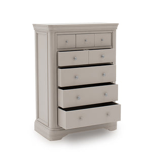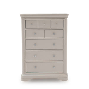 Introducing the Mabel Tall Chest 8 Drawers: Elevate Your Bedroom with Timeless Beauty and Practicality. Designed to showcase the natural beauty of wood, this taupe painted collection exudes elegance with its silver handles and graceful curves. Crafted with durability in mind, each piece is both beautiful and practical. Featuring button tufted details, curved headboards, and decorative accents, this range adds a touch of sophistication to any space. Made with high-quality materials including linen look fabric, MDF, metal, and pine, the Mabel Tall Chest 8 Drawers offers lasting quality and style. Transform your bedroom into a haven of comfort and style with the Mabel Range.