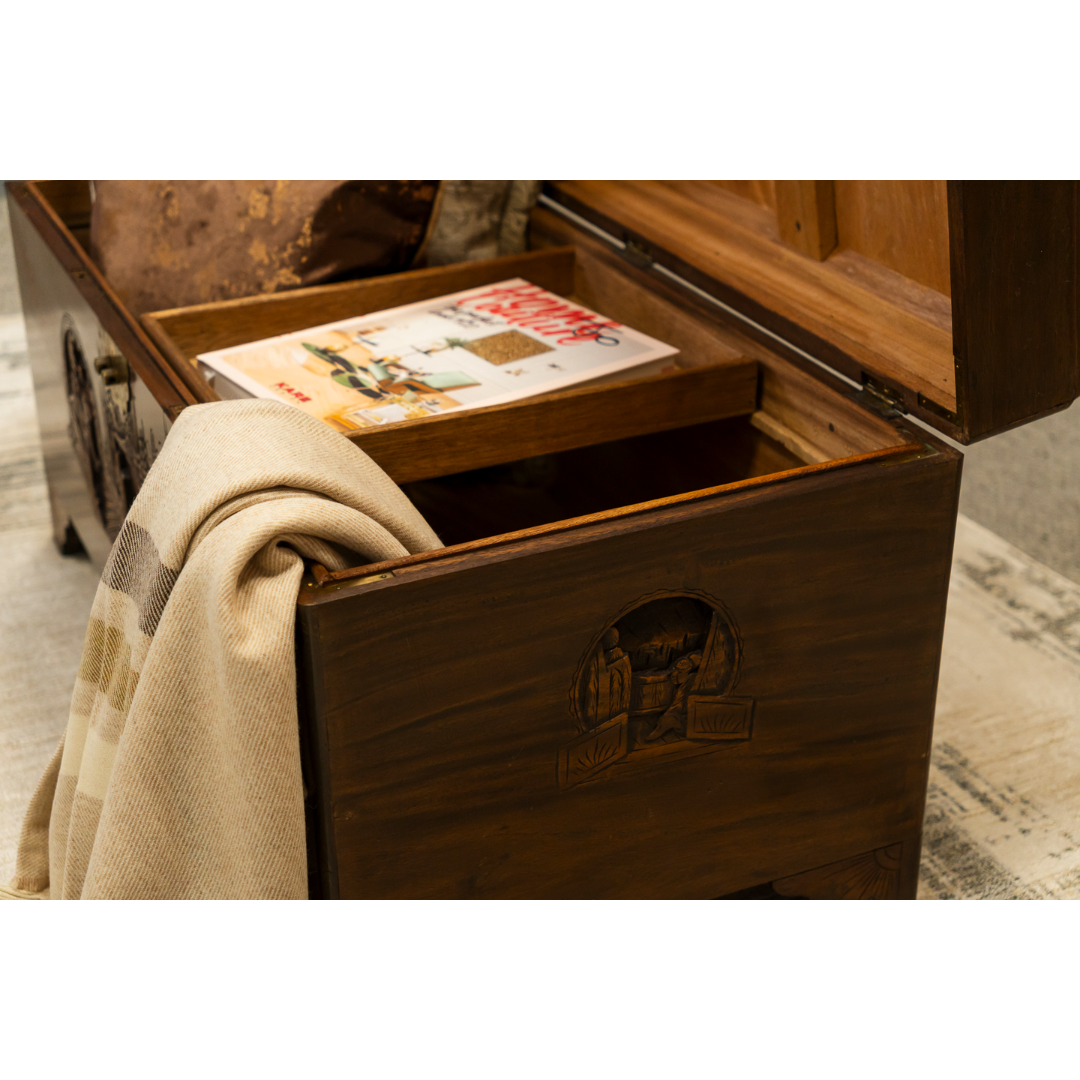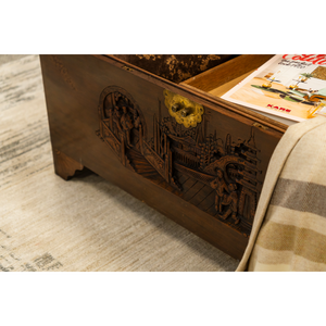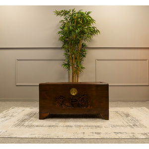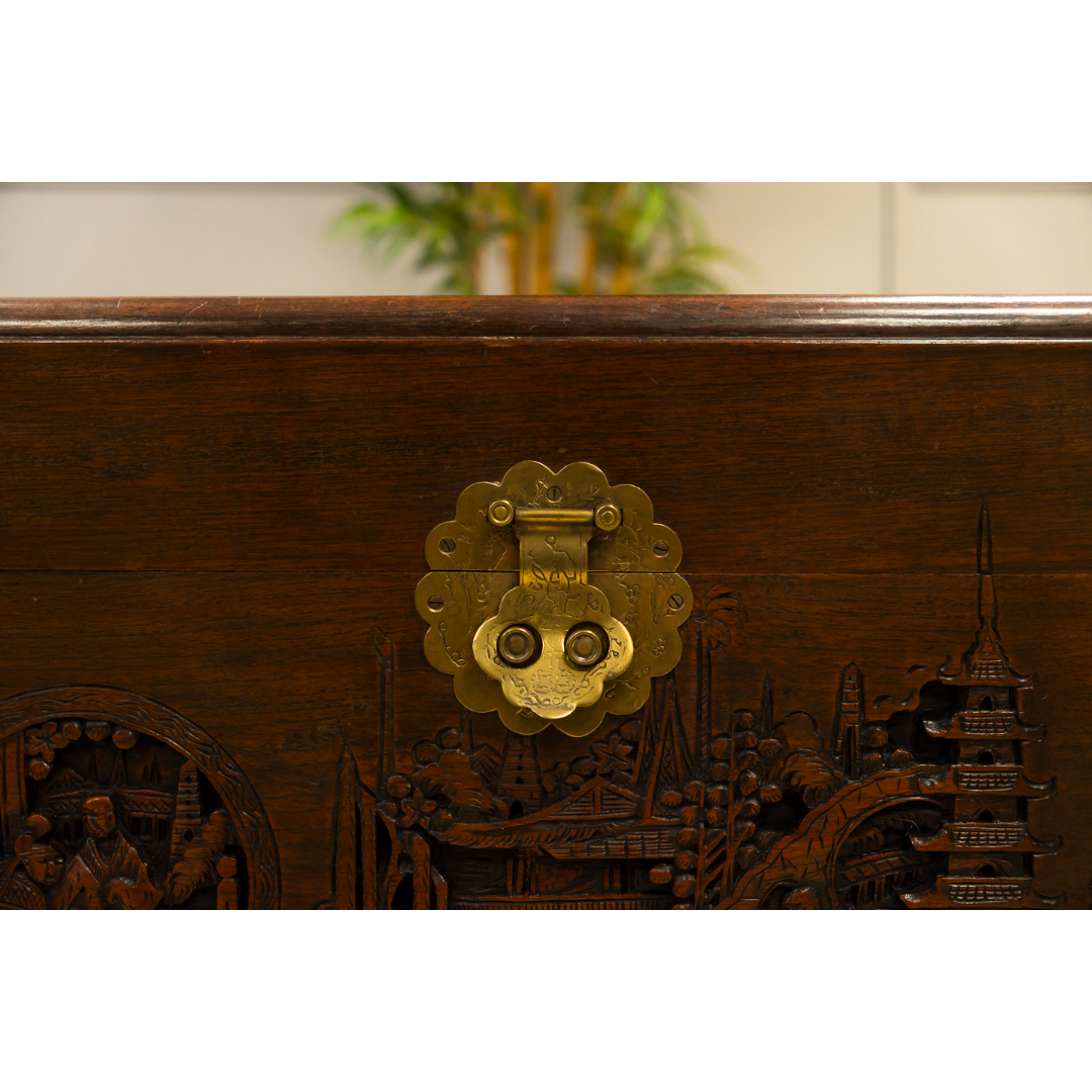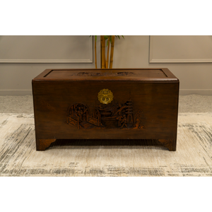 Oriental Camphon Wood Trunk hinged lid with carved panel