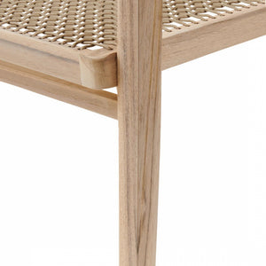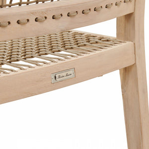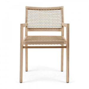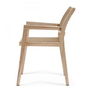 A formal looking dining armchair designed for outdoor use but would not look out of place indoors either. The frame is made from responsibly cut teak which is proven to be excellent in outdoor settings and the seat and gently curved back are finished with a lattice of rope wonderfully braided by hand giving seating comfort as well allowing a cooling airflow.
