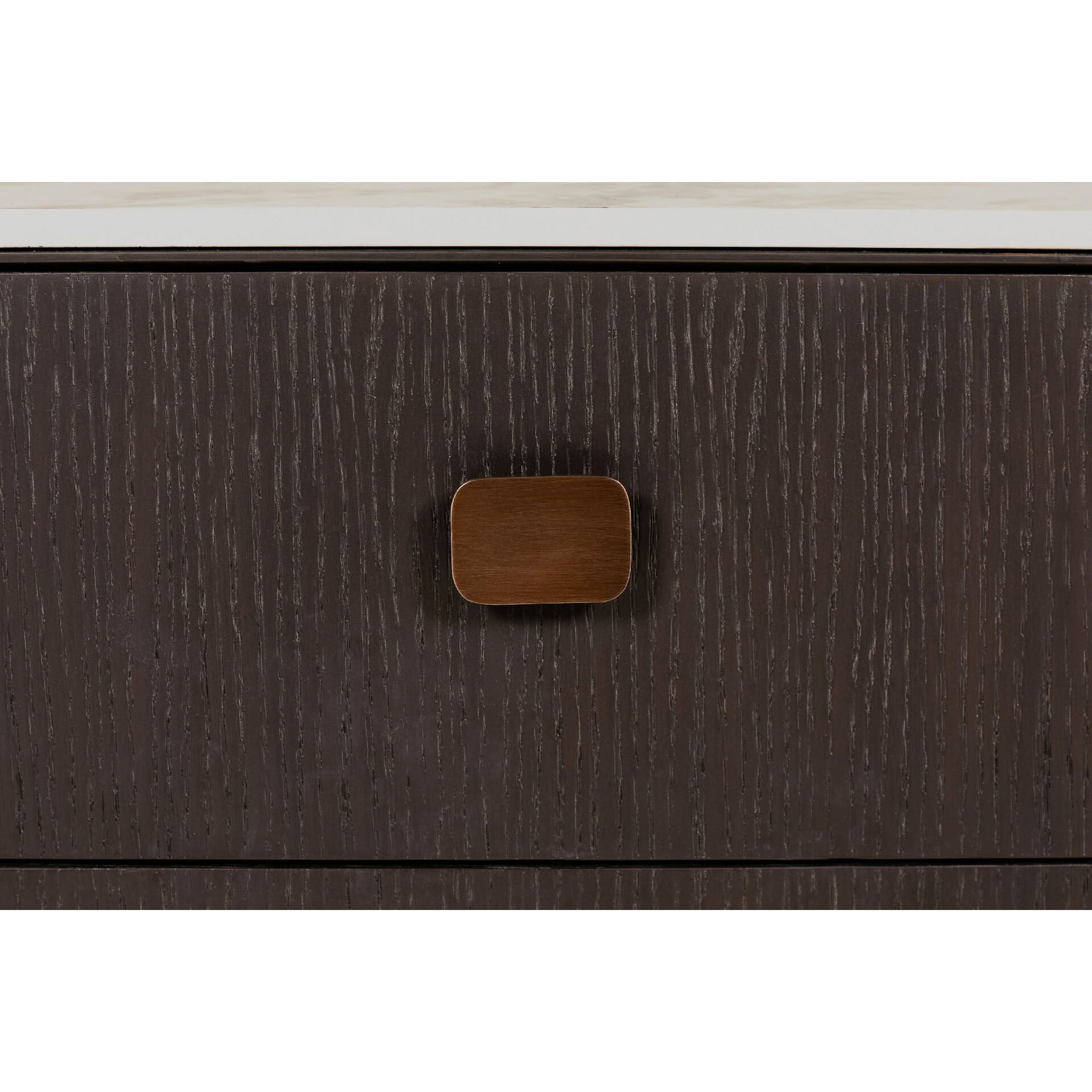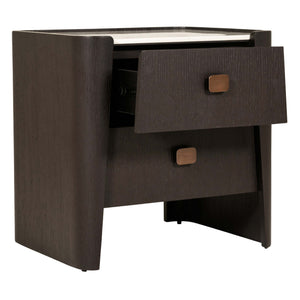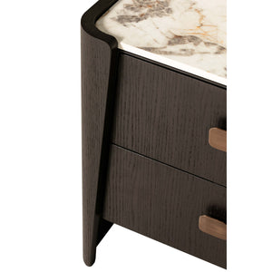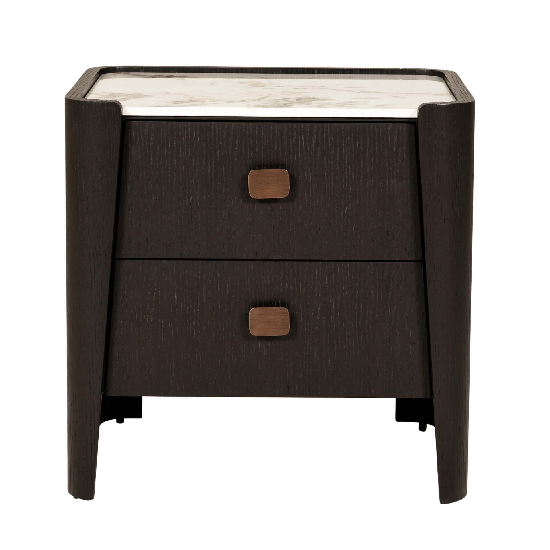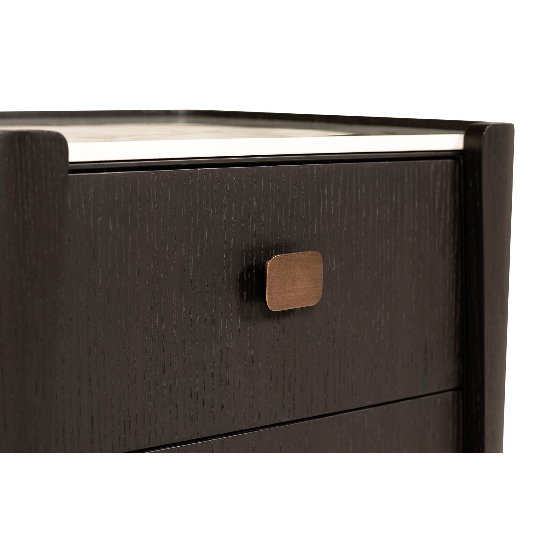 Introducing the Rhodes 2 Drawer Bedside Locker in Ebony—a pinnacle of luxury and sophistication for your bedroom. Expertly crafted with meticulous detail, it features a sleek ebony finish and copper metal handles, exuding contemporary elegance. The sintered stone top is both stain and scratch-resistant, ensuring durability and easy maintenance. Enjoy stylish storage with this high-end, durable bedside table.