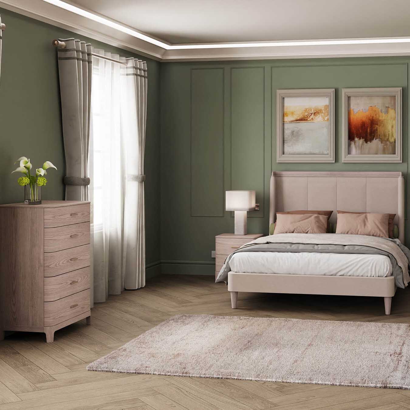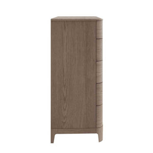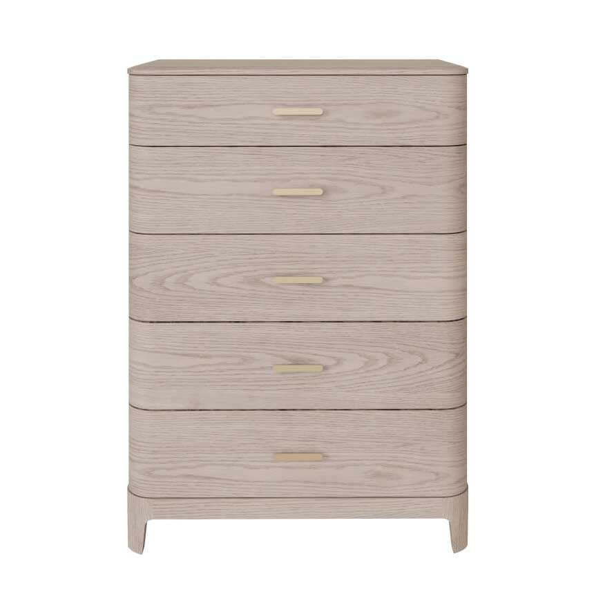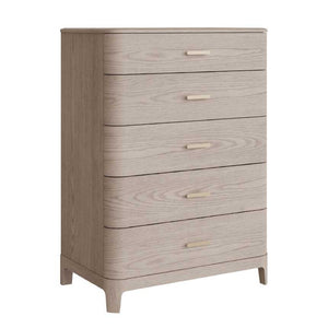Introducing the Sahara Tall Chest 5 Drawer in Parisian Cream by Vida. This sophisticated piece boasts an elegant brushed gold metal handle and smooth metal runners for seamless drawer closing. Its rich natural color and soft, curved edges highlight the exquisite texture of the ash veneer wood grain, making it a stylish addition to any modern bedroom.