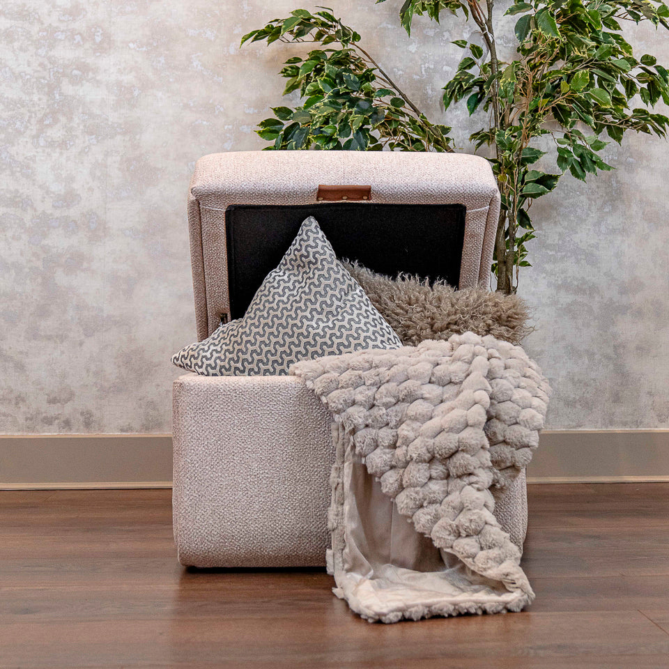 Complete your bedroom with the elegant Serrno Stool with Storage. Wrapped in the same soft, textured fabric as the Serrno bed and bench, this stylish stool features smooth curves, designer-inspired finish.