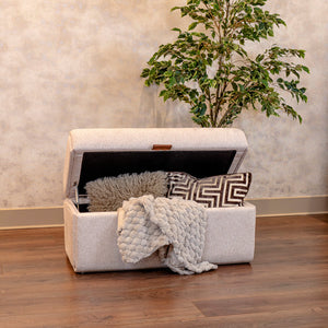 Add style and smart storage to any room with the Serrno Fabric Bench. Upholstered in a soft, textured fabric, this sleek bench opens to reveal generous internal storage — ideal for blankets, cushions, or everyday clutter.