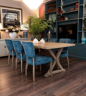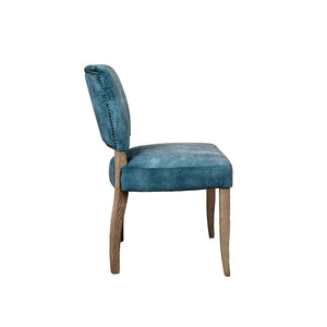 Elevate your dining space with the Shaw Dining Chair in sea blue, a perfect blend of comfort, elegance, and timeless craftsmanship. Upholstered in rich, soft fabric, this chair features a gently padded seat and a studded back for a refined finish. The solid oak legs bring warmth and durability, beautifully complementing the blue tone for a sophisticated look.