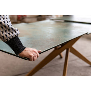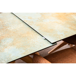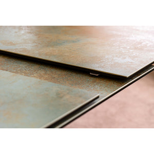 Elevate your dining experience with the stunning Terra Verde Extending Dining Table. This industrial-inspired piece combines rustic charm with modern functionality. The tabletop, with its unique greenish-blue tones, adds a touch of natural beauty to your space.
