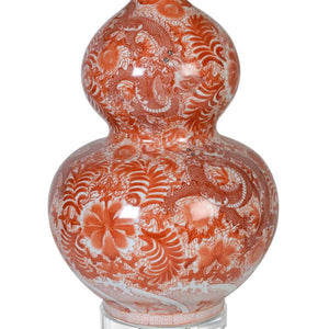 Vintage Orange Double-Gourd Table Lamp with Floral Pattern & Shade