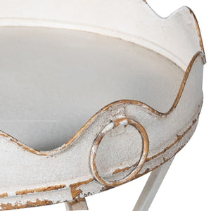 Bring a touch of old-world charm to your space with this vintage-style Distressed Iron Side Table. Featuring wavy edges and a circular tabletop, the table boasts a faded paint finish that enhances its antique appeal. The distressed white metal frame and folding design make it both practical and decorative, perfect for displaying decor or serving as a rustic accent in your home. With its elegant yet weathered look, this side table adds character and charm to any room, blending effortlessly with both vintage and eclectic styles.