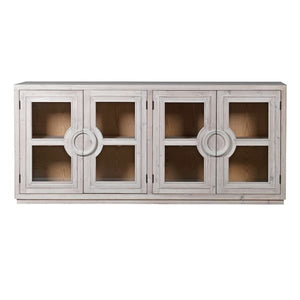 Add eco-friendly charm to your home with this 4-Door Sideboard, crafted from recycled pine and plywood with a stylish white-washed finish. The clear glass panels on each door allow you to display decor or store items like glasses and accessories, while the rustic, aged look brings warmth and character to any space. Featuring elegant circular ring handles for smooth door operation, this sideboard offers two spacious shelves for functional storage. Perfect for adding both sustainability and style to your living or dining area.