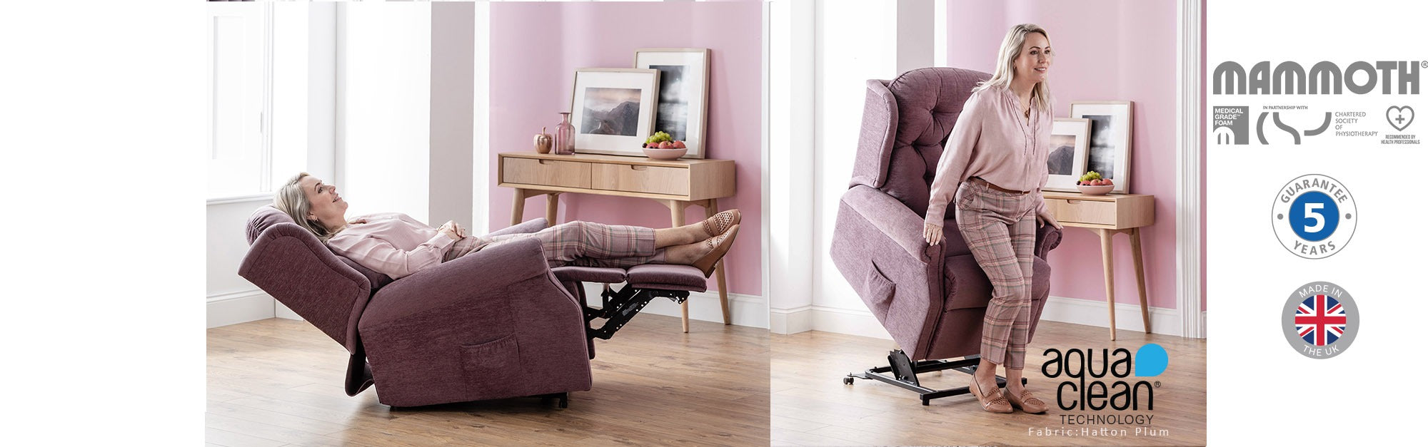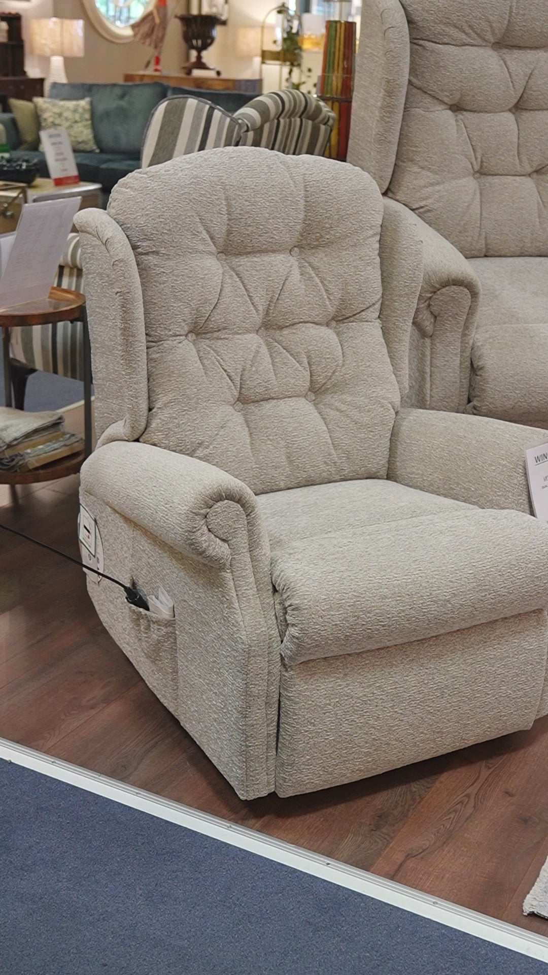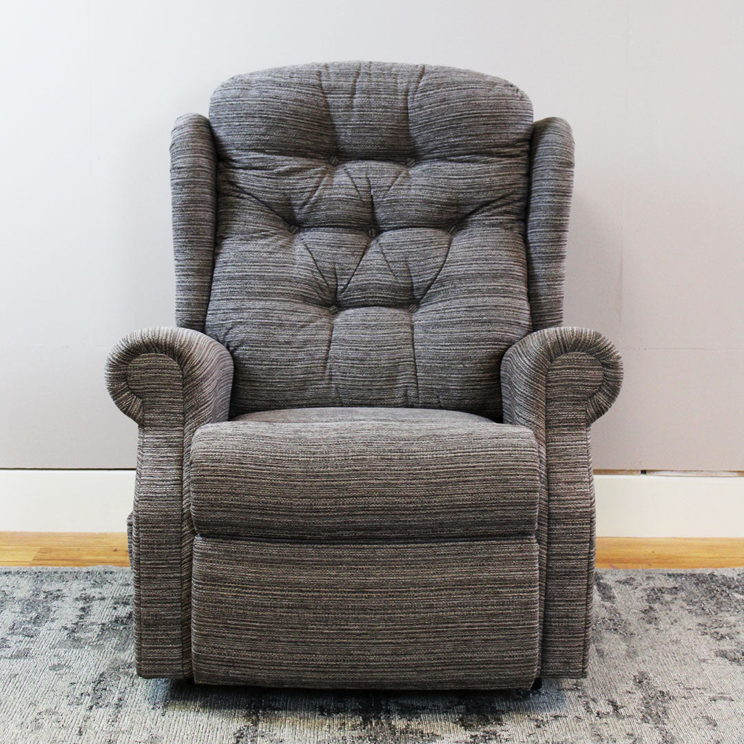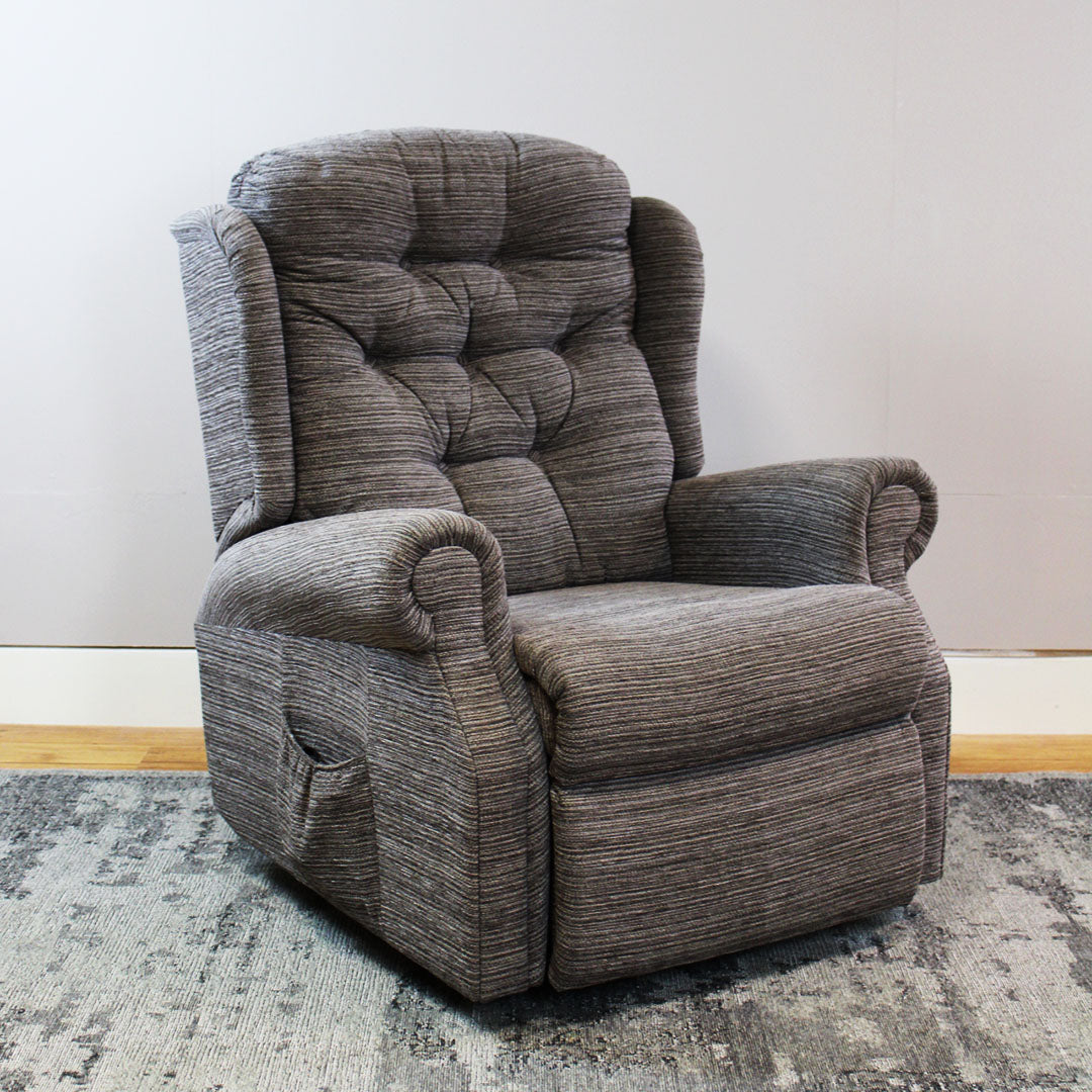 The Winchester Dual Motor Lift and Tilt Recliner Chair- Grande is our most popular recliner, featuring a deep buttoned back, supportive sit and stylish scroll arms. Available in fabric or leather. The Winchester fabric models* settees are fitted with Mammoth Medical Grade™ Foam Seating Technology as standard. All power buttons have a handy USB charging port.